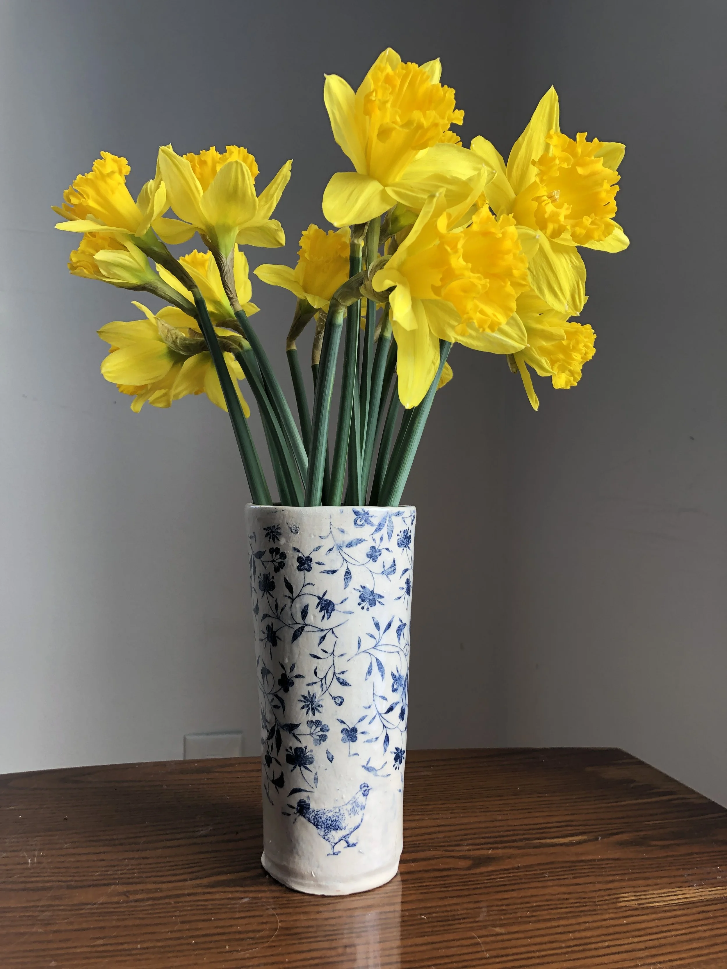 Consciously created, The Canterbury Collection features hand-built functional and decorative ceramics with an antique textural feel and look. A smooth, buff-colored, glazed interior contrasts with a rough, stone-like exterior decorated with fragments of blue floral antique wallpaper and vintage images of farm animals. Inspired by the simple, pure aesthetic of my neighbors at Canterbury Shaker Village, this original work highlights an intuitive way of working. Each piece is individually created by hand, and as such each will have subtle variations in shape, colors and size.